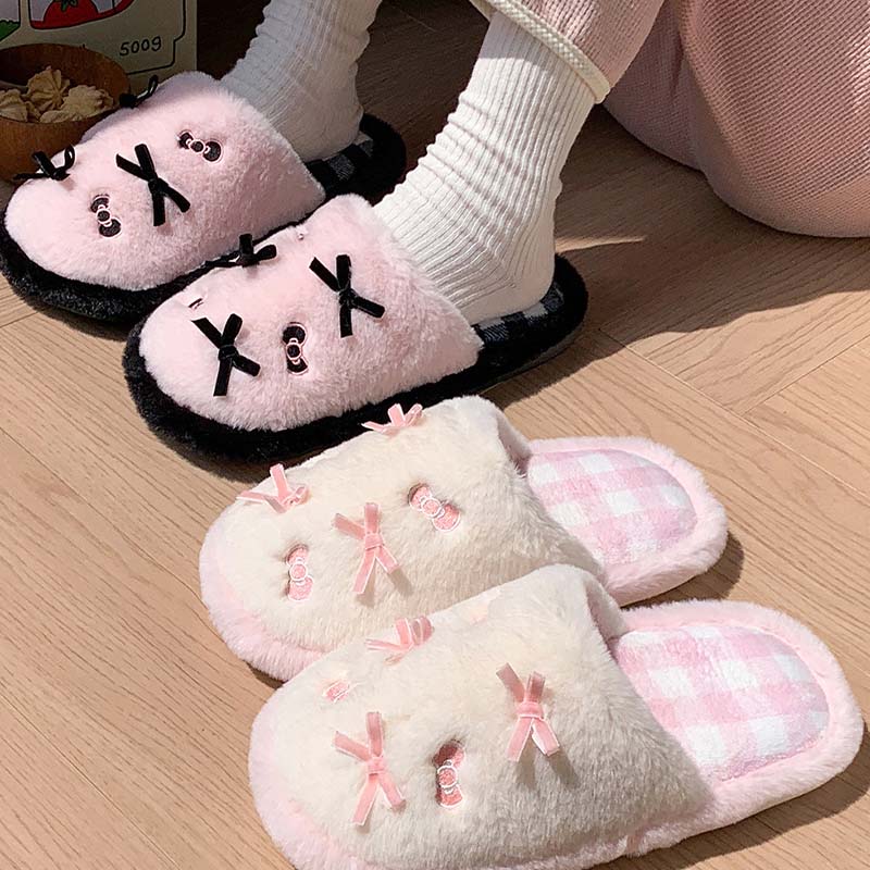 Name:Women Cute Plush Warm House Slippers With Little Bow