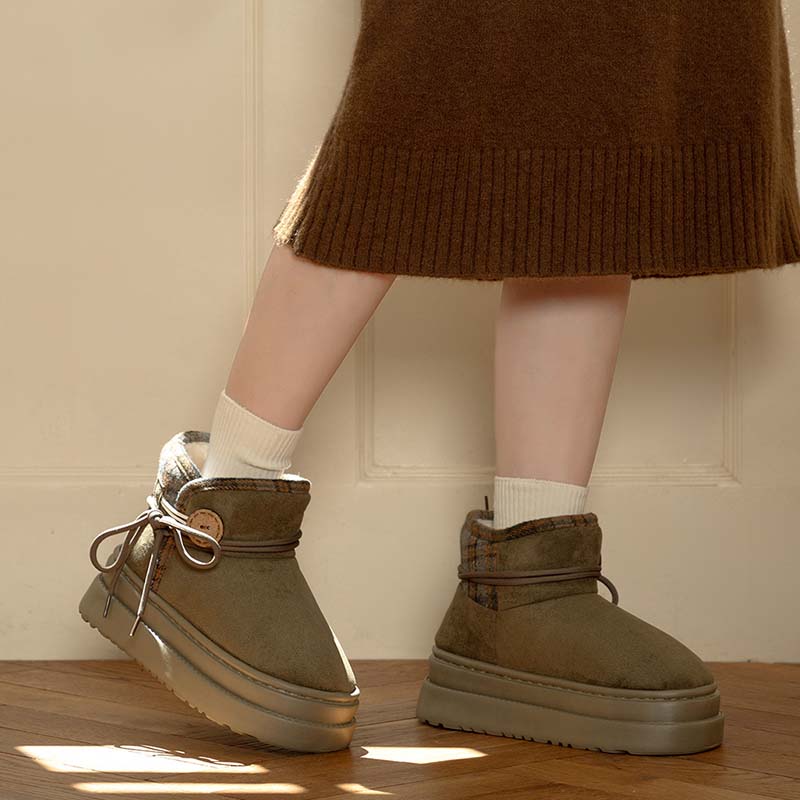 Suede Winer Warm Snow Boots Plush Inner With Buttons And Shoelaces Decor